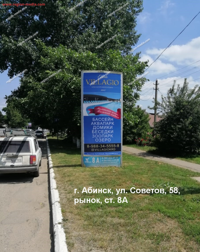 Реклама на пилларах в Абинске ул.Советов, 58 слева; Рынок А − один из примеров, демонстрирующих профессионализм сотрудников РА «Регион Медиа Групп». В рамках маркетинговой кампании было запланировано размещение материалов в ТРЦ, кинотеатрах. После анализа предложения клиента и бюджета было принято решение об использовании пилларов.
