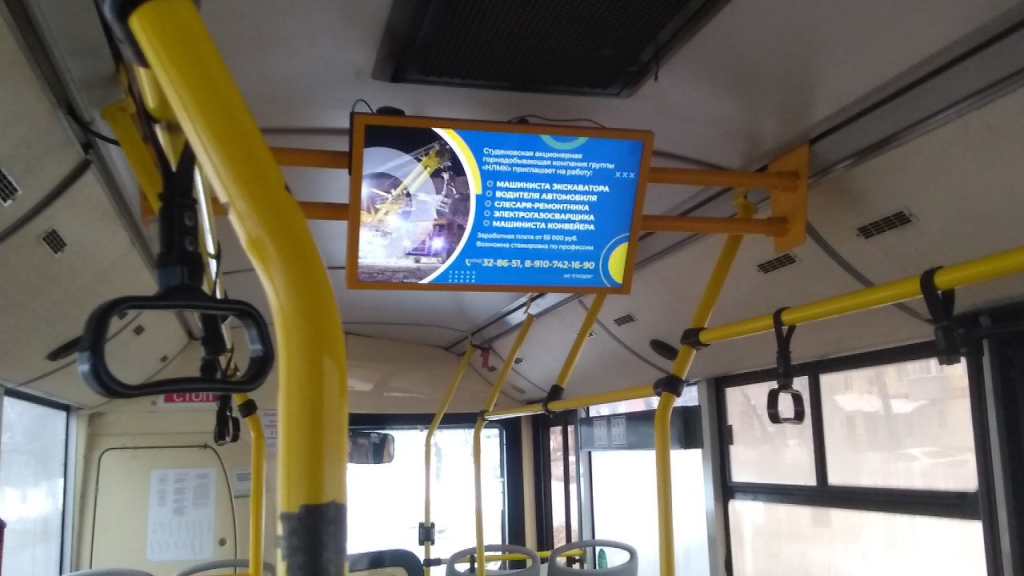 Цифровые экраны в салонах в Альметьевске . Современный и всё более популярный формат. Видеомониторы позволяют транслировать динамичные видеоролики. Их ключевые преимущества — возможность оперативно менять контент хоть каждый день, настраивать показ по времени суток (например, рекламу бизнес-ланчей днём, а доставку ужинов — вечером) и по конкретным маршрутам. Видео привлекает больше внимания, чем статическое изображение, и позволяет рассказать целую историю о продукте.