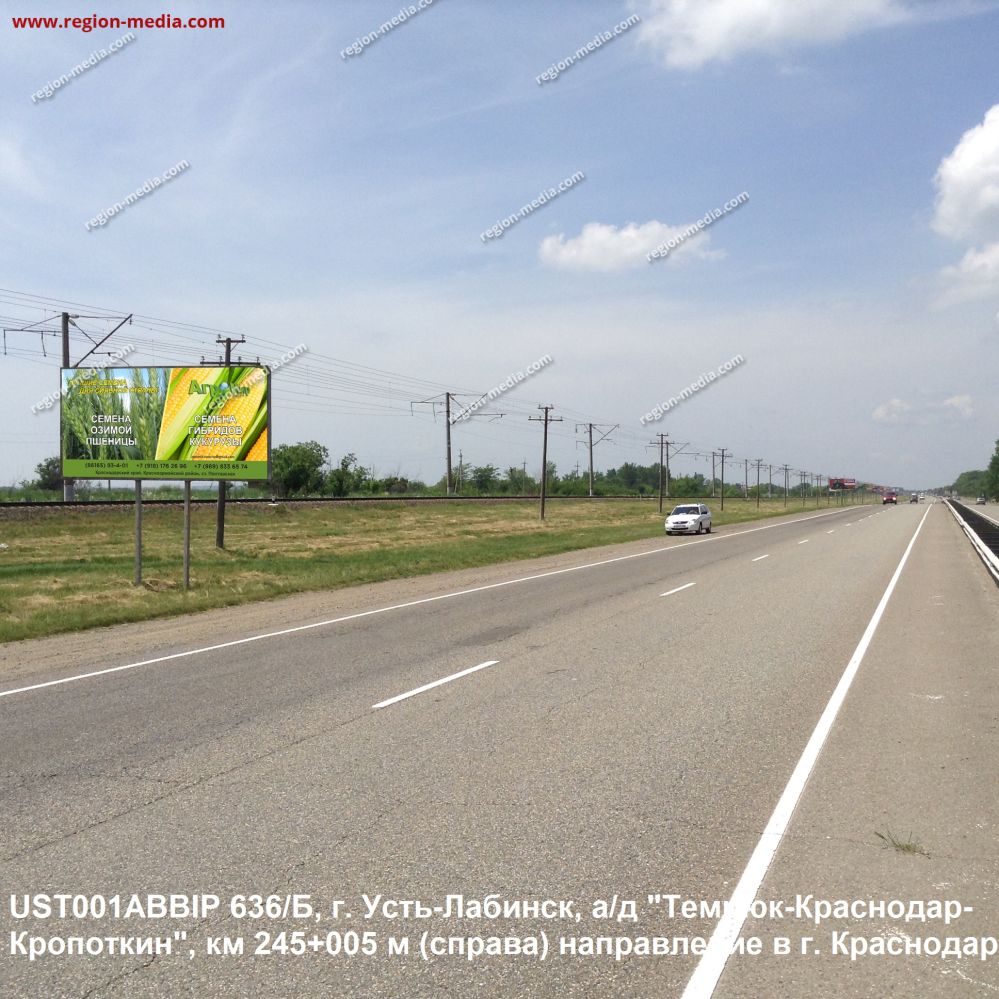 Реклама на щитах 3х6 в Усть-Лабинске ад Темрюк-Краснодар-Кропоткин км. 245+005 (справа) направление в г. Краснодар Б − пример успешной работы специалистов РА «Регион Медиа Групп». Наружная конструкция хорошо видна с разных ракурсов, заметна издалека, привлекает внимание пешеходов, водителей, пассажиров общественного транспорта.