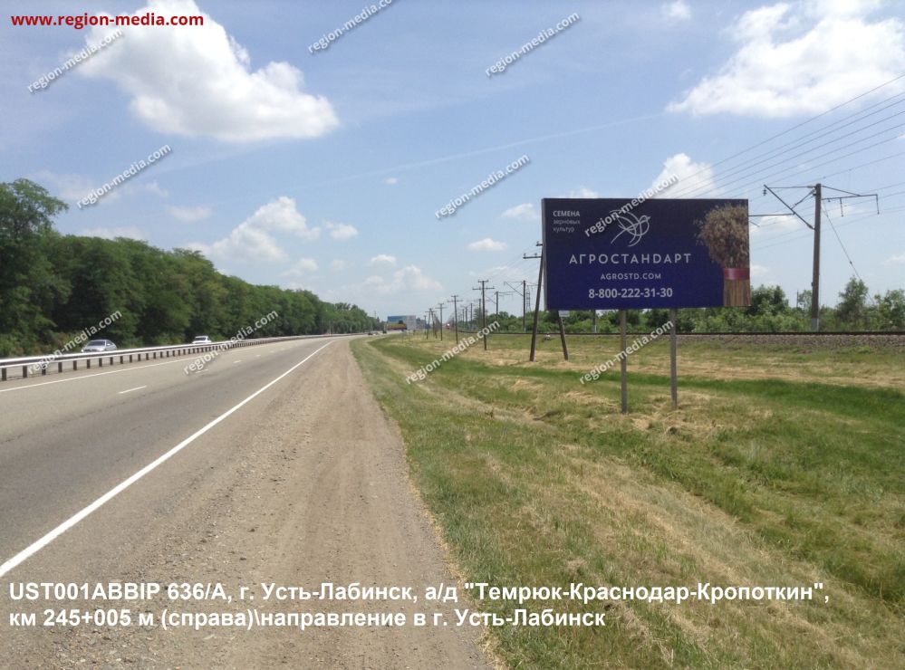Реклама на щитах 3х6 в Усть-Лабинске ад Темрюк-Краснодар-Кропоткин км. 245+005 (справа) направление в г. Усть-Лабинск А − пример успешной работы специалистов РА «Регион Медиа Групп». Наружная конструкция хорошо видна с разных ракурсов, заметна издалека, привлекает внимание пешеходов, водителей, пассажиров общественного транспорта.