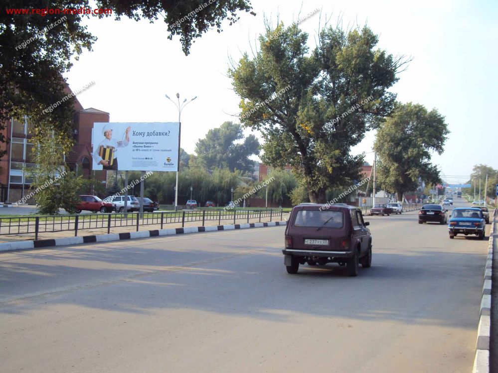Реклама на щитах 3х6 в Каневской ул.Гагарина-Горького (Центр. Универмаг) сторона Б − пример успешной работы специалистов РА «Регион Медиа Групп». Наружная конструкция хорошо видна с разных ракурсов, заметна издалека, привлекает внимание пешеходов, водителей, пассажиров общественного транспорта.