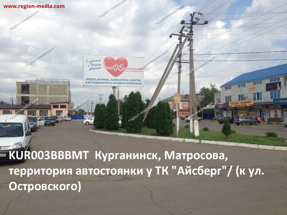 Реклама на щитах 3х6 в Курганинске ул. Матросова, территория автостоянки у ТК Айсберг (к ул. Островского) Б − пример успешной работы специалистов РА «Регион Медиа Групп». Наружная конструкция хорошо видна с разных ракурсов, заметна издалека, привлекает внимание пешеходов, водителей, пассажиров общественного транспорта.