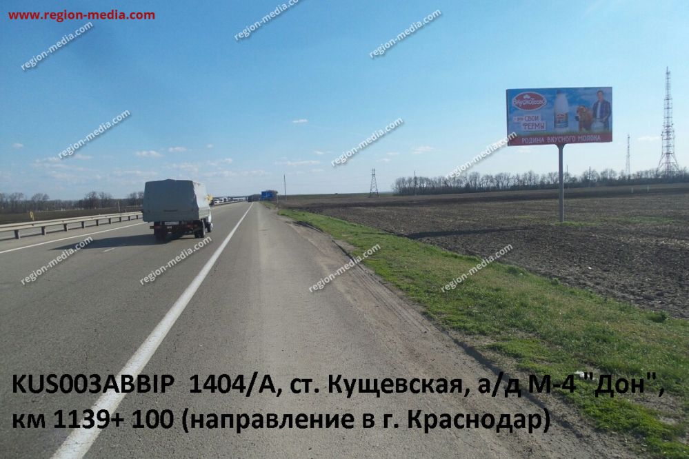 Реклама на щитах 3х6 в Кущевской ад М-4 Дон, км 1139+ 100 (направление в г. Краснодар) А − пример успешной работы специалистов РА «Регион Медиа Групп». Наружная конструкция хорошо видна с разных ракурсов, заметна издалека, привлекает внимание пешеходов, водителей, пассажиров общественного транспорта.