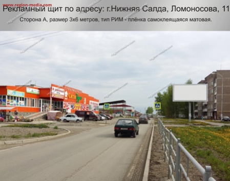 Реклама на щитах 3х6 в Нижней Салде ул.Ломоносова, 11 А − пример успешной работы специалистов РА «Регион Медиа Групп». Наружная конструкция хорошо видна с разных ракурсов, заметна издалека, привлекает внимание пешеходов, водителей, пассажиров общественного транспорта.