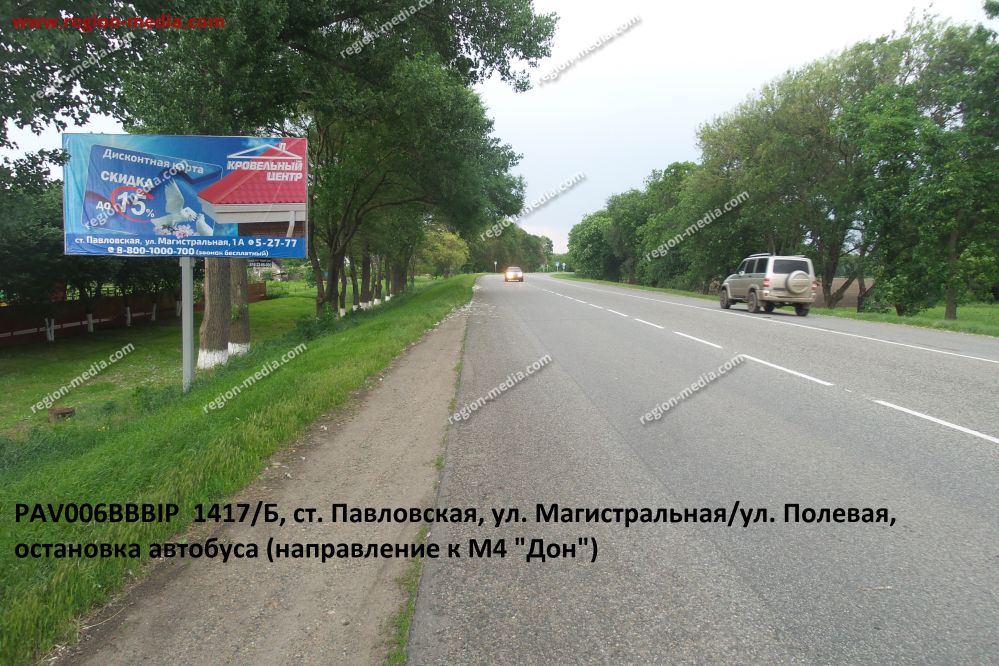 Реклама на щитах 3х6 в Павловской ул. Магистральнаяул. Полевая, остановка автобуса (направление к М4 Дон) Б − пример успешной работы специалистов РА «Регион Медиа Групп». Наружная конструкция хорошо видна с разных ракурсов, заметна издалека, привлекает внимание пешеходов, водителей, пассажиров общественного транспорта.