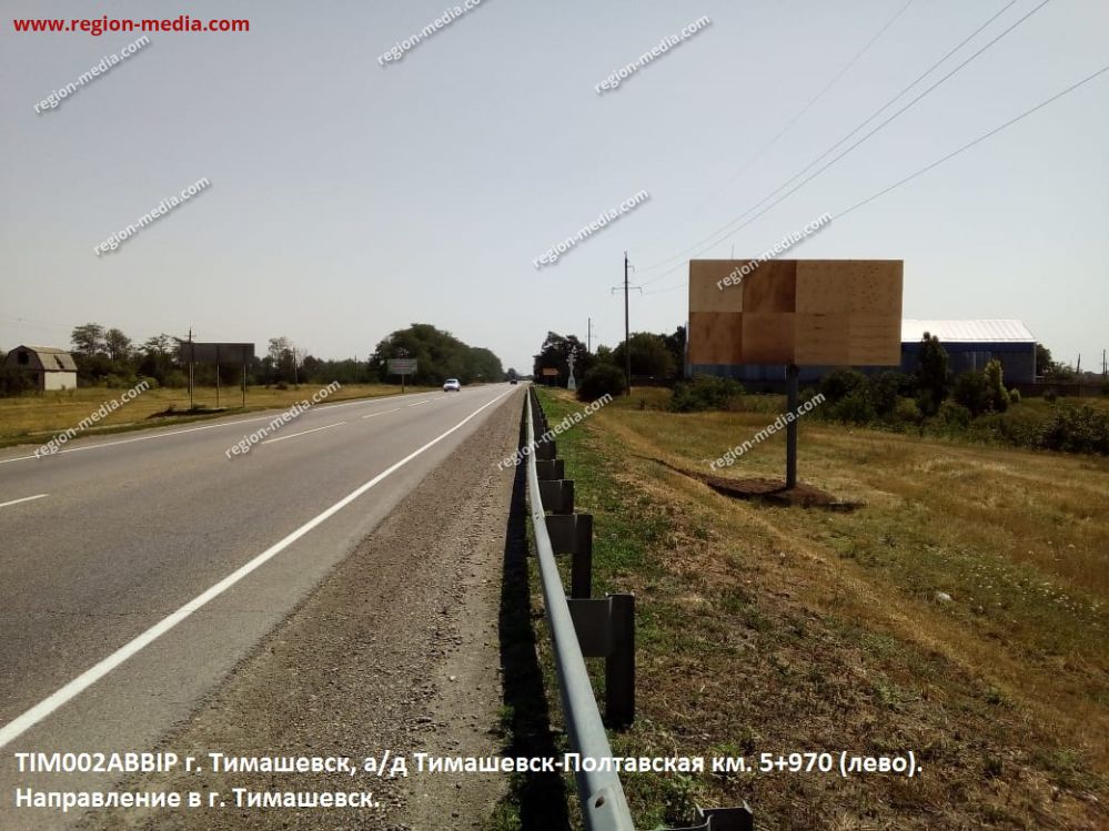 Реклама на щитах 3х6 в Тимашевске ад Тимашевск-Полтавская км 5+970 (лево). Направление в г. Тимашевск. А − пример успешной работы специалистов РА «Регион Медиа Групп». Наружная конструкция хорошо видна с разных ракурсов, заметна издалека, привлекает внимание пешеходов, водителей, пассажиров общественного транспорта.