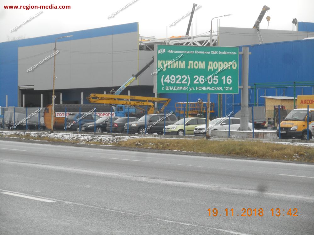 Реклама на щитах 3х6 во Владимире Юрьевец (1й щит) ул. Ноябрьская 131, около ТД Аксон. (А) − пример успешной работы специалистов РА «Регион Медиа Групп». Наружная конструкция хорошо видна с разных ракурсов, заметна издалека, привлекает внимание пешеходов, водителей, пассажиров общественного транспорта.