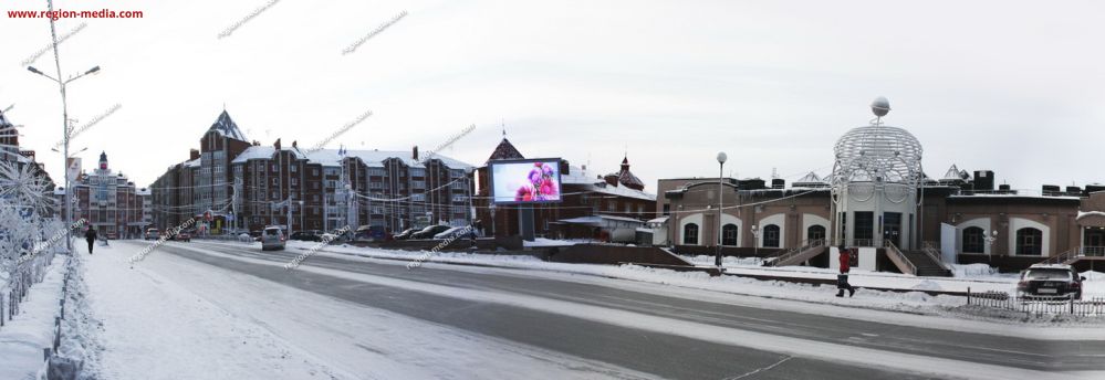 Одним из направлений работы сотрудников РА «Регион Медиа Групп» является подготовка и демонстрация контента на современных видеоэкранах. Он может быть представлен клипом, текстом, анимационным роликом и т. д. В качестве примера нашей работы приведём рекламу на видеоэкранах в Салехарде ул. Чубынина 17.