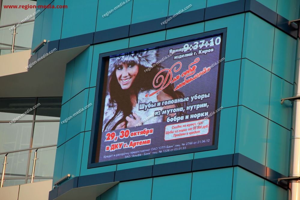 Одним из направлений работы сотрудников РА «Регион Медиа Групп» является подготовка и демонстрация контента на современных видеоэкранах. Он может быть представлен клипом, текстом, анимационным роликом и т. д. В качестве примера нашей работы приведём рекламу на видеоэкранах в Артеме на ТЦ «Артлюкс».