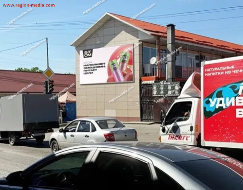 Одним из направлений работы сотрудников РА «Регион Медиа Групп» является подготовка и демонстрация контента на современных видеоэкранах. Он может быть представлен клипом, текстом, анимационным роликом и т. д. В качестве примера нашей работы приведём рекламу на видеоэкранах в Гойтах Кадырова, 47 (Центральный рынок).